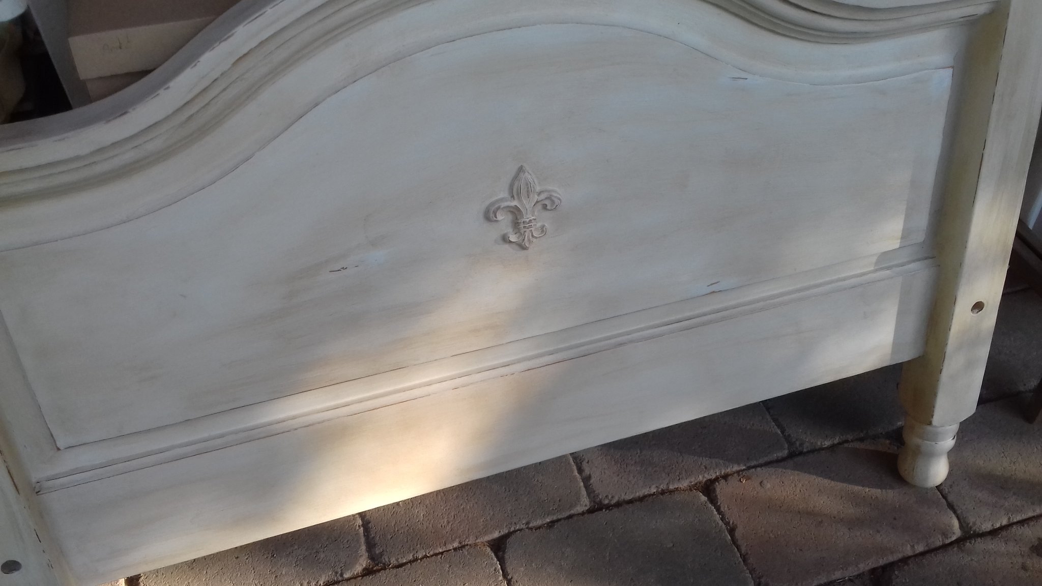 Miután megszáradtak az elemek, jöhet a végleges festék. Annie Sloan krétafestéket használok, ehhez pedig az Original White színt választottam. Két rétegben festettem le az ágyat, így szebben takart. Aki nem ismeri annak mondom, hogy gyorsan szárad, ezért nagyon kényelmes vele dolgozni. (Különösen nyáron a kertben.) Száradás után finom csiszoló papírral az íveket, a liliomokat, sarkokat átcsiszoltam, hogy kopottas hatást érjek el. Egyébként sem mellékes egy gyerekszobában, ahol sűrűn történik baleset, és leverődik a festék. Legalább nem fog feltűnni senkinek:)