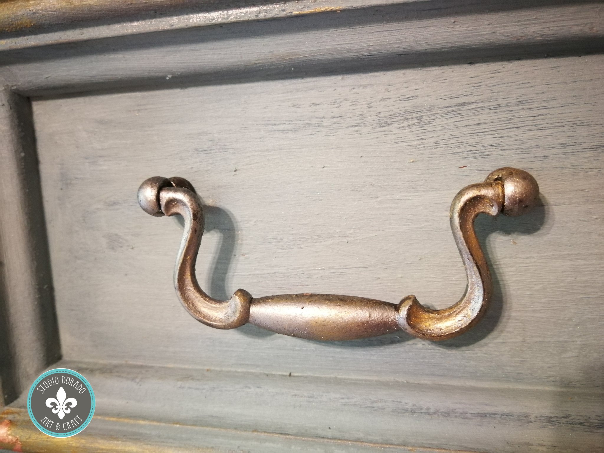 A fiókok fogantyúi sem maradtak eredeti színűek, ezekre szintén Annie Sloan Bright Silver metal wax, és Pentart arany wax keverékét kentem fel egyszerűen az ujjaimat használva:)