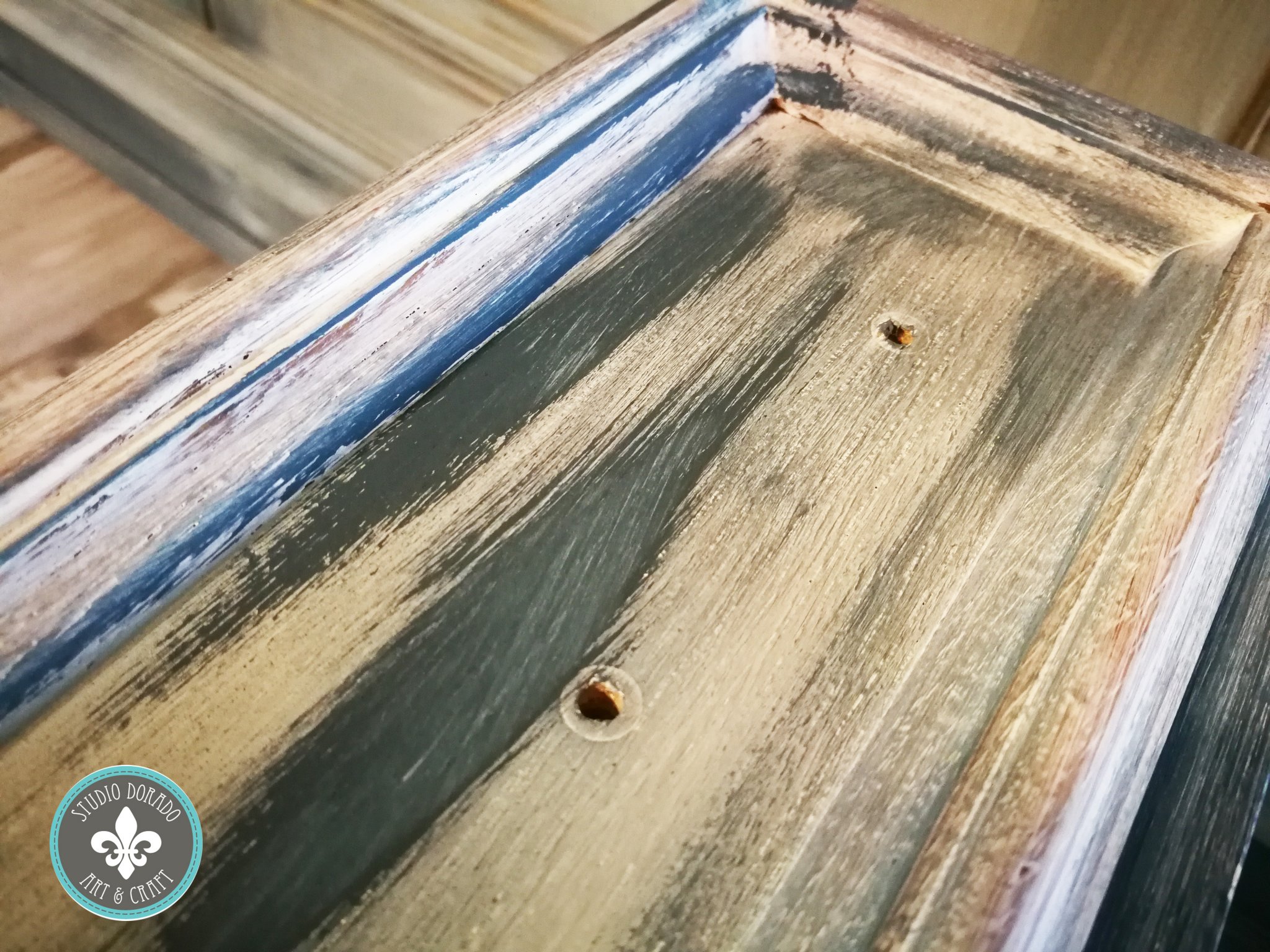 Először a legsötétebb színt kentem fel az Aubusson Blue-t. A bútor alsó részér került a legtöbb, mert a szintén kékes árnyalatú padlótól szerettem volna kissé elkülöníteni látványban. Foltokban azonban mindenhol megjelenik.