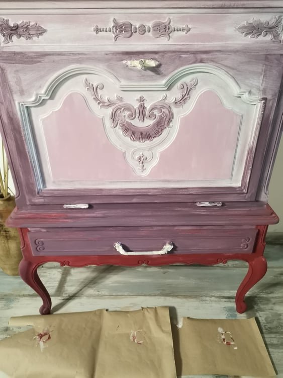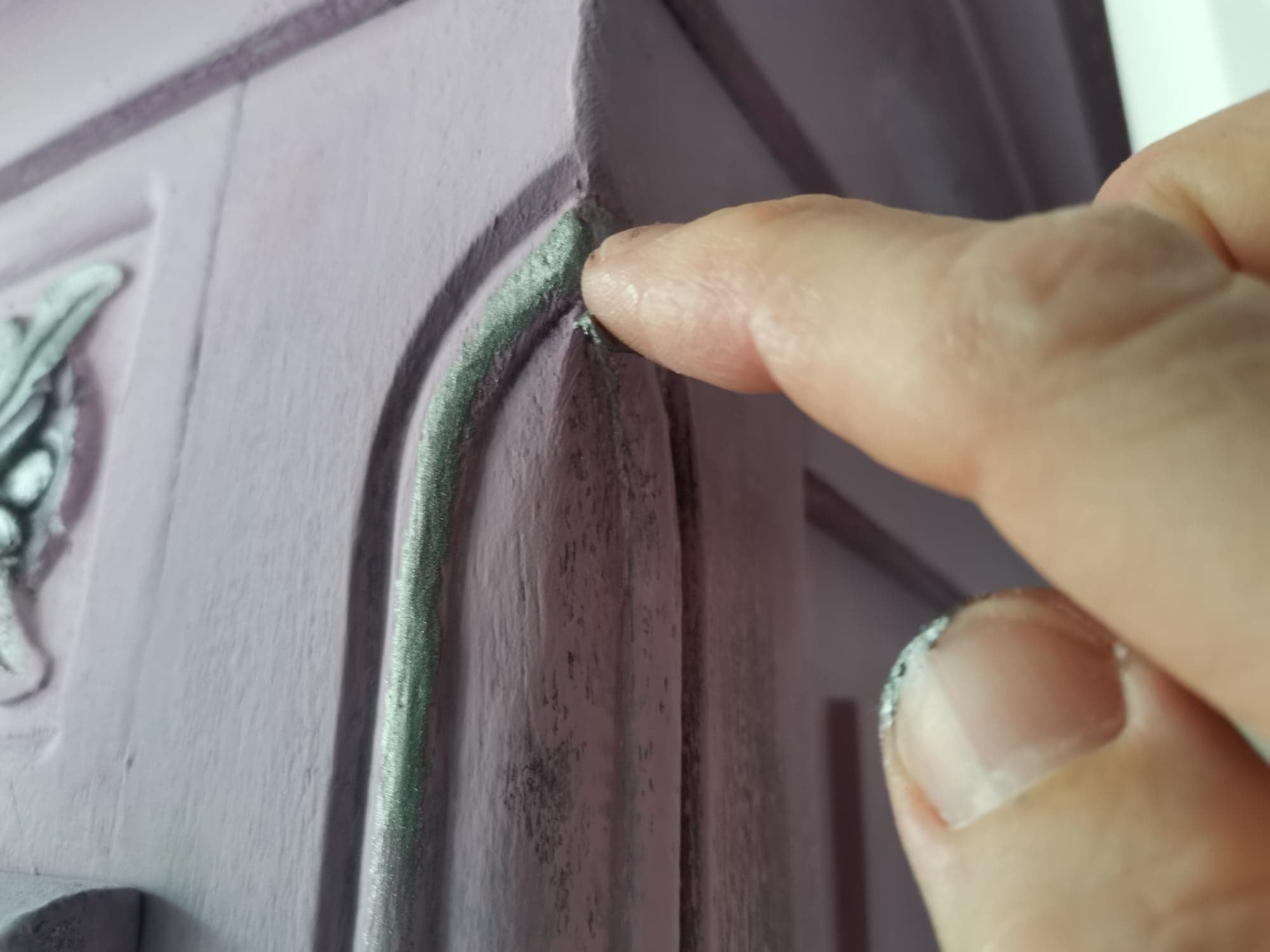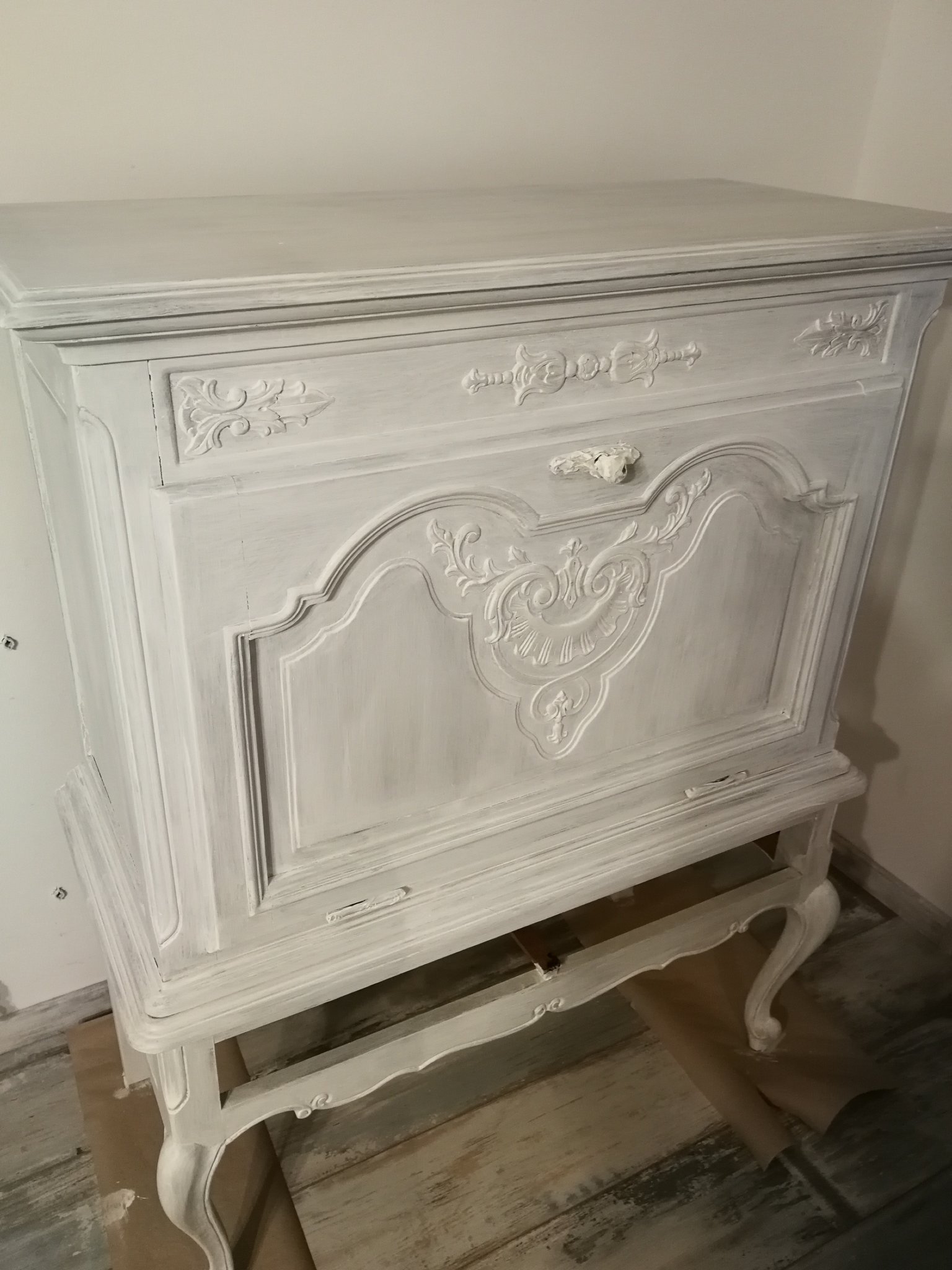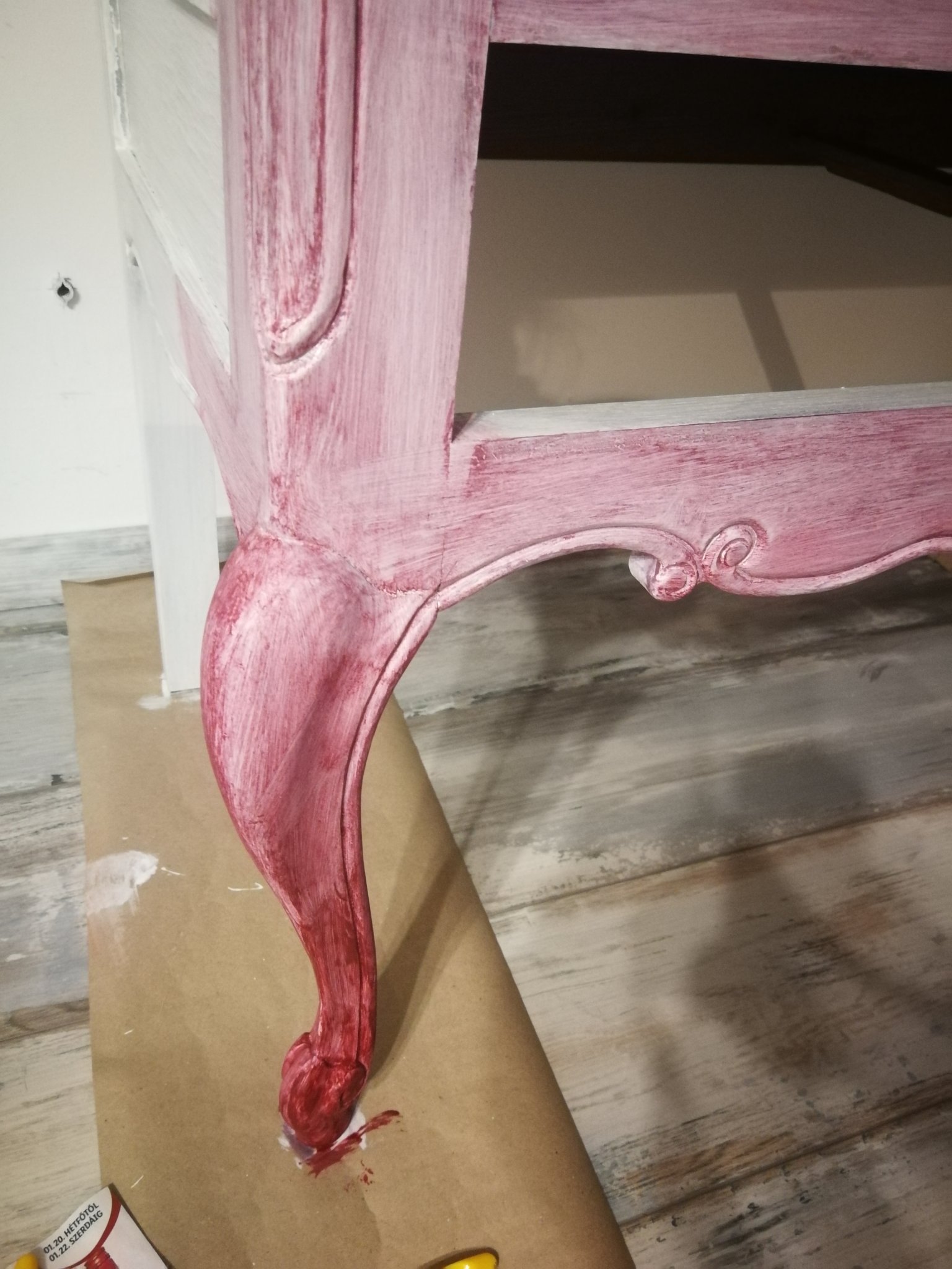 A bútor felső részét a festék teljes száradása után 180-as csiszolópapírral óvatosan megcsiszoltam, portalanítottam, majd Pearlescent Glaze -Gyöngyházfény lakkkal kentem le 2 rétegben.