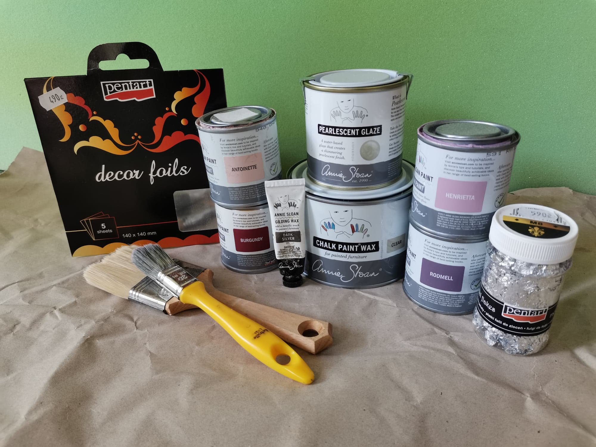 Annie Sloan Burgundi, Rodmell, Henrietta, Antoinette, Pearlescent Glaze, Clear wax, Gilding wax-dark silver.