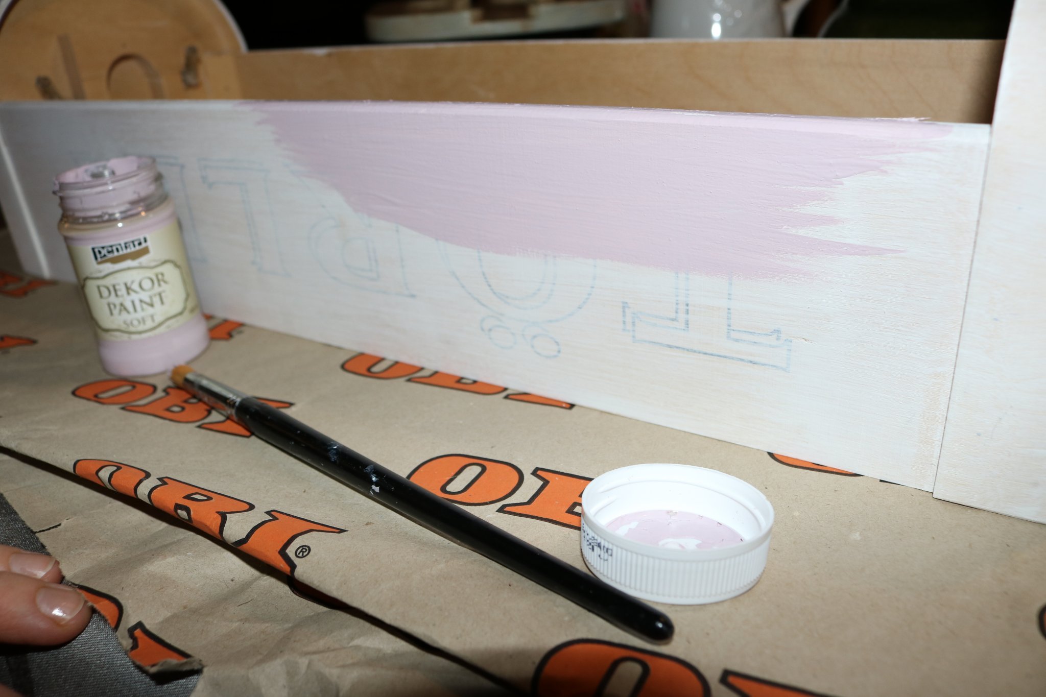 A kötélből készült fogót betekertem maszkoló szalaggal, hogy véletlenül se legyen festékes. Ezután alapozó festékkel átkentem kívül belül. Most a végső színként Pentart Dekor Paint rózsaszínt választottam. Az egész dobozt ezzel festettem le két rétegben, így sikerült eltüntetnem az eredeti feliratot.