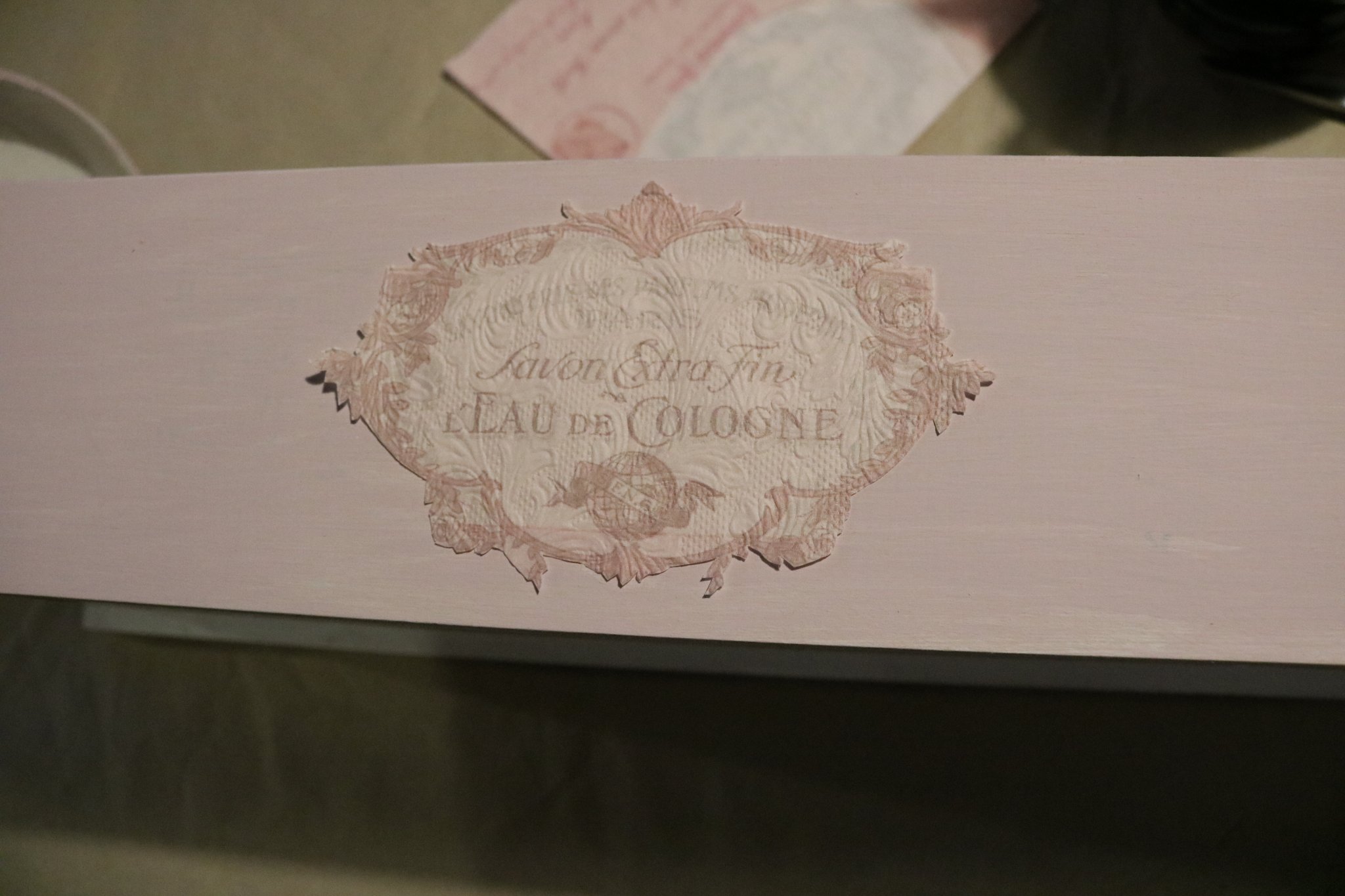 Decoupage technikával díszítettem az oldalát. (Szalvéta legfölső vékony rétegét ragasztom fel a felületre decoupage ragasztóval.)
