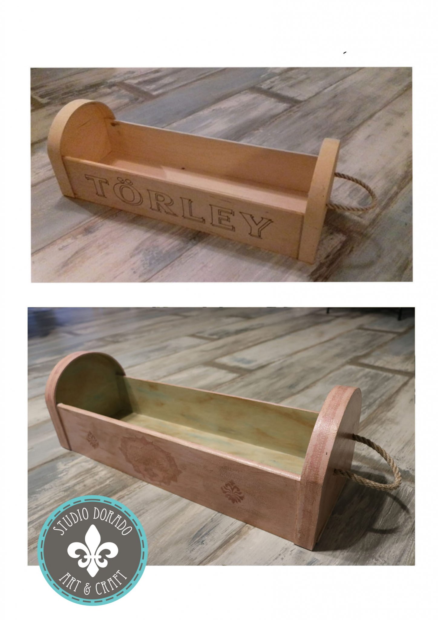 Száradás után szilikon nyomdával pár motívumot nyomtam még rá. Majd végül lakkal zártam az egész felületet. A doboz belsejét is lefestettem, majd lakkoztam.